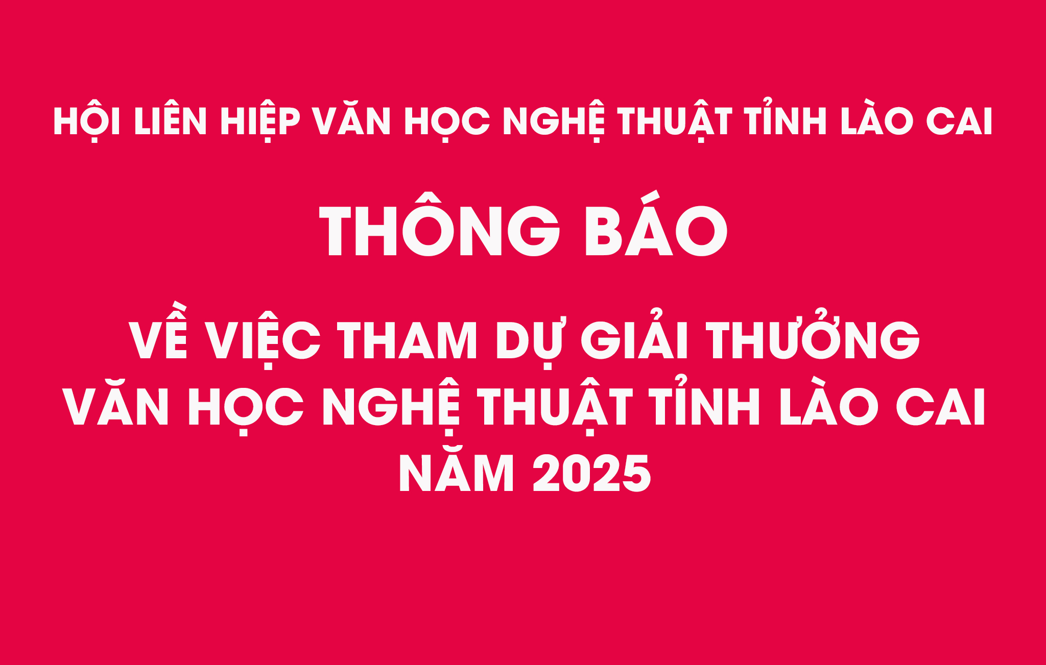 Thông báo chính thức từ Hội Liên hiệp Văn học Nghệ thuật tỉnh Lào Cai về việc tham dự Giải thưởng VHNT năm 2025, mời các hội viên và nghệ sĩ tham gia.